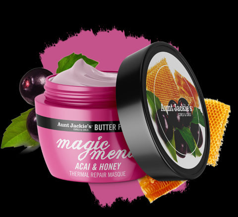 Treat your hair to the ultimate pampering with Aunt Jackie's Butter Fusions MAGIC MEND Acai & Honey Thermal Repair Masque. This luxurious deep conditioning treatment is specially formulated to repair and nourish dry, damaged hair.
